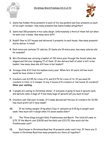 PDF Christmas Word Problems - Free Math Worksheets by Math-Drills Christmas Word Problems 1. Santa can see up to 25 children per hour. What is the maximum number of children he can see in 6 hours? 150 children 2. The price for each reindeer harness is $17.95. What is the price for 9 reindeer harnesses? $161.55 Challenge: If the tax rate is 14%, how much would 9 reindeer harnesses including tax cost? $184.17 3.