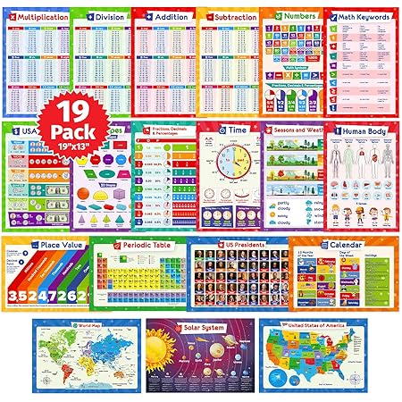 Math Educational Learning Posters,Laminated Math Charts with Tape for Children Kids Homeschool Elementary and Middle School Teach,Multiplication ...