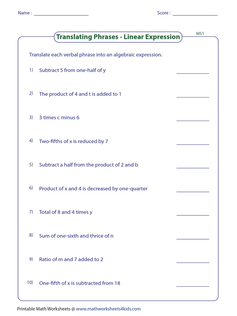 40 printable math worksheets translating phrases